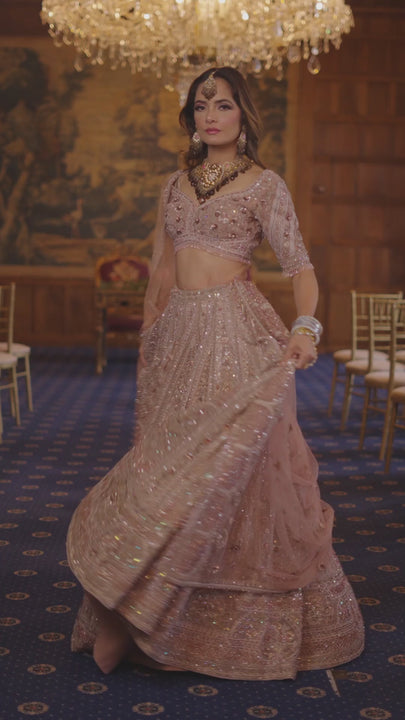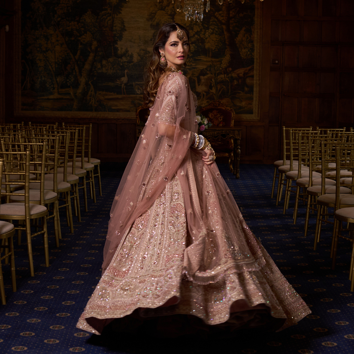 Luxurious silk velvet bridal fully detailed with intricate tone on tone embroidery consisting of fine pearls, crystals and subtle sequence. This bridal has two dupattas included and it offers a soft, elegant, and classic feel, ideal for a tender and charming look.